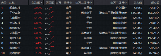 细分方向来看,芯片产业链持续走高,此前遭受荷兰不公正对待的闻泰科技午后涨停,三季报业绩亮眼的寒武纪涨超6%;苹果产业链强势上攻,工业富联涨超9%,立讯精密涨逾7%,歌尔股份涨逾6%;PCB(印制电路板)亦有亮眼表现,东山精密涨超8%,生益科技、鹏鼎控股涨逾7%。